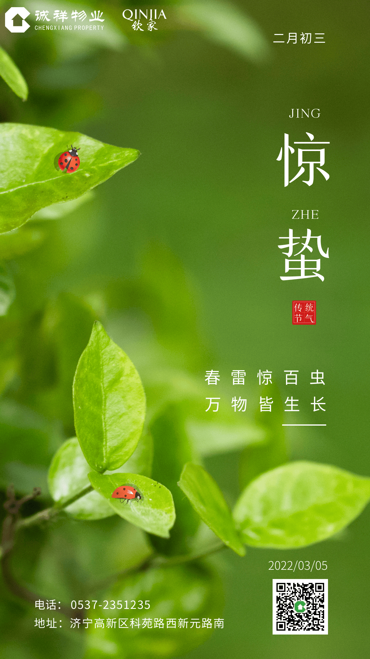 惊蛰,又名“启蛰”,是二十四节气中的第三个节气。斗指丁,太阳到达黄经345°,于公历3月5-6日交节。惊蛰反映的是自然生物受节律变化影响而出现萌发生长的现象。时至惊蛰,阳气上升、气温回暖、春雷乍动、雨水增多,万物生机盎然。农耕生产与大自然的节律息息相关,惊蛰节气在农耕上有着相当重要的意义,它是古代农耕文化对于自然节令的反映。