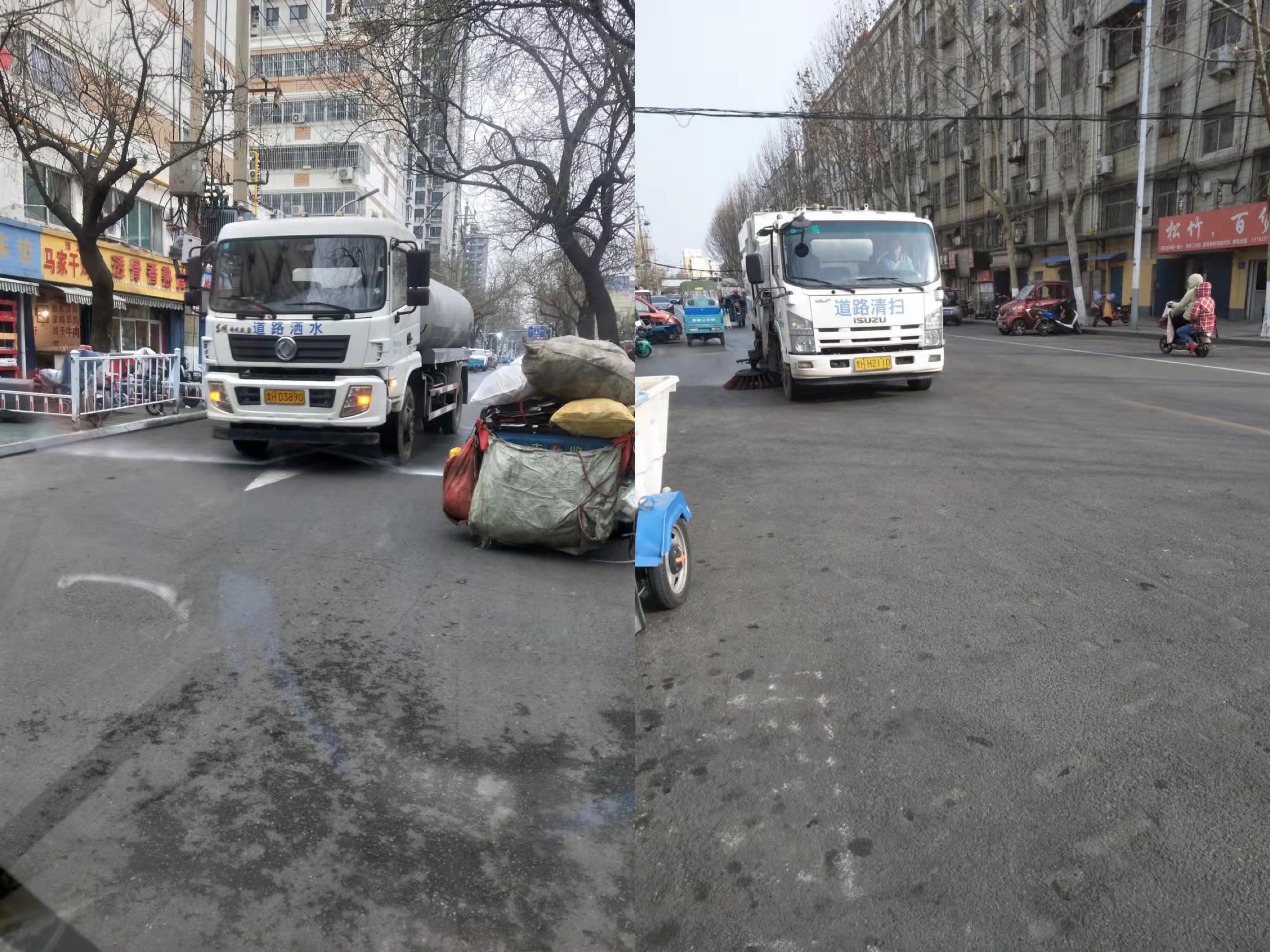 环卫工人每日对辖区主次干道进行冲、扫、洒机械作业,提高道路整洁度,做到降尘、清扫、保洁无缝隙。