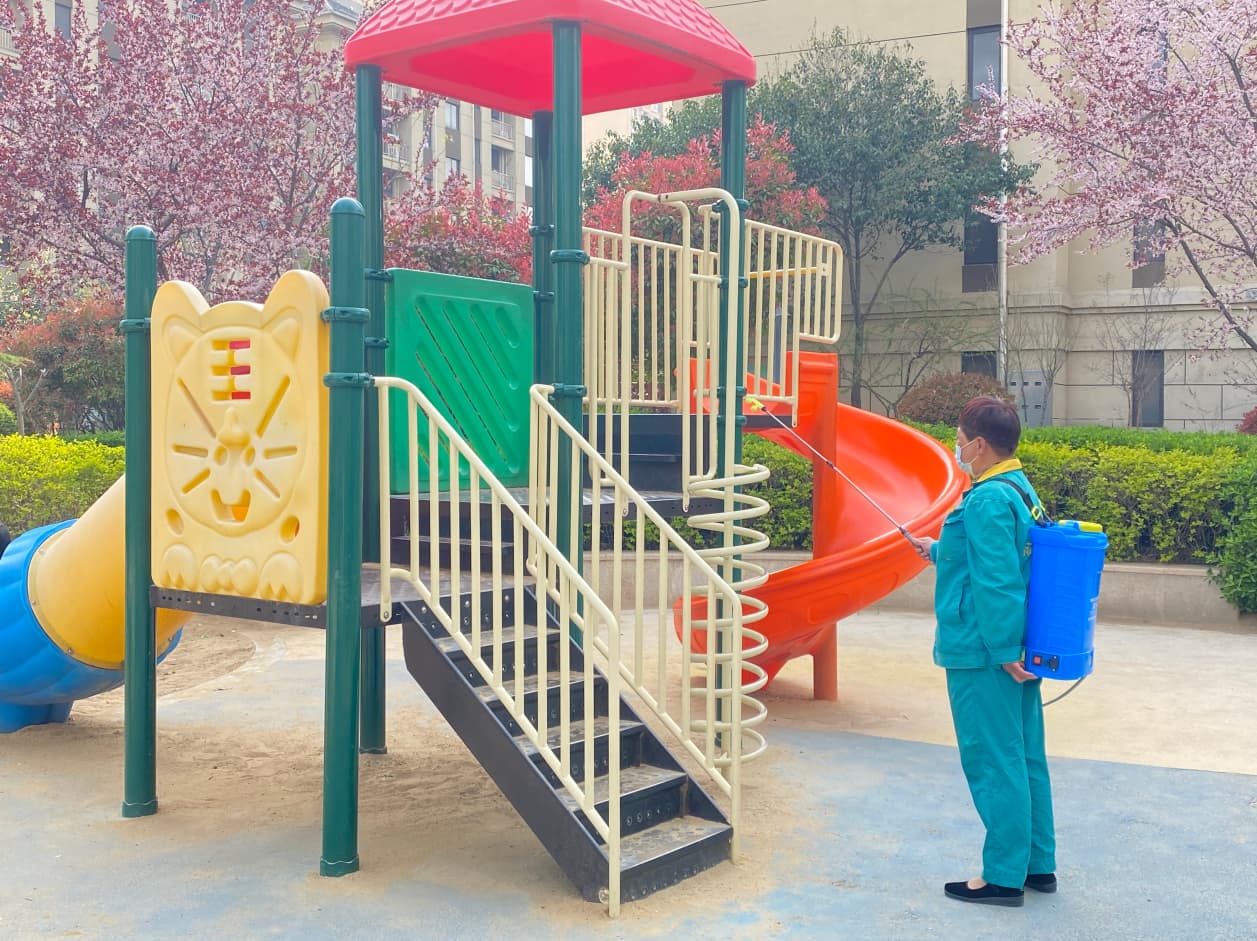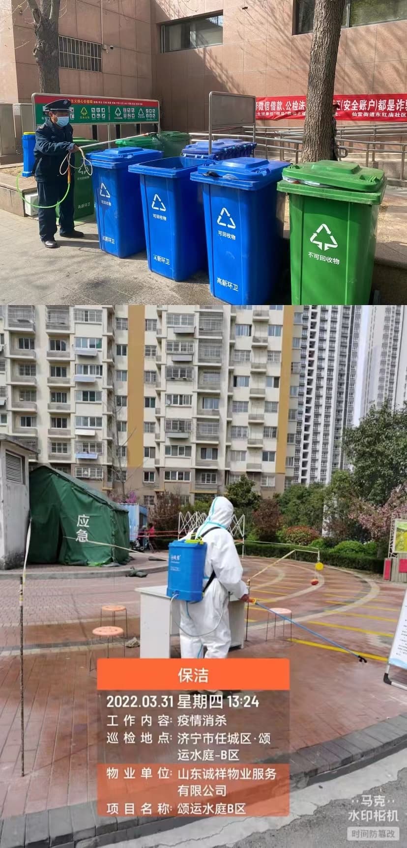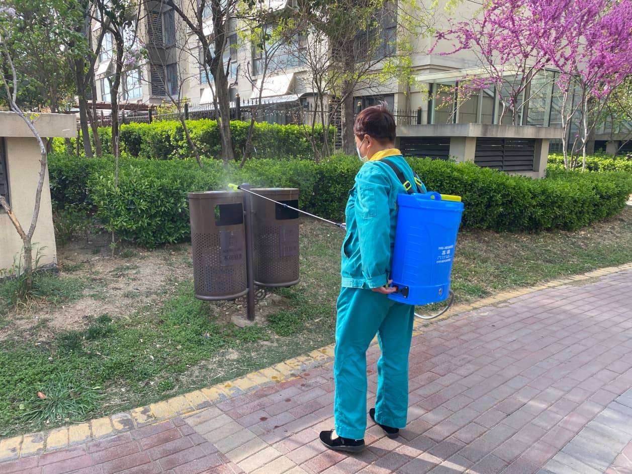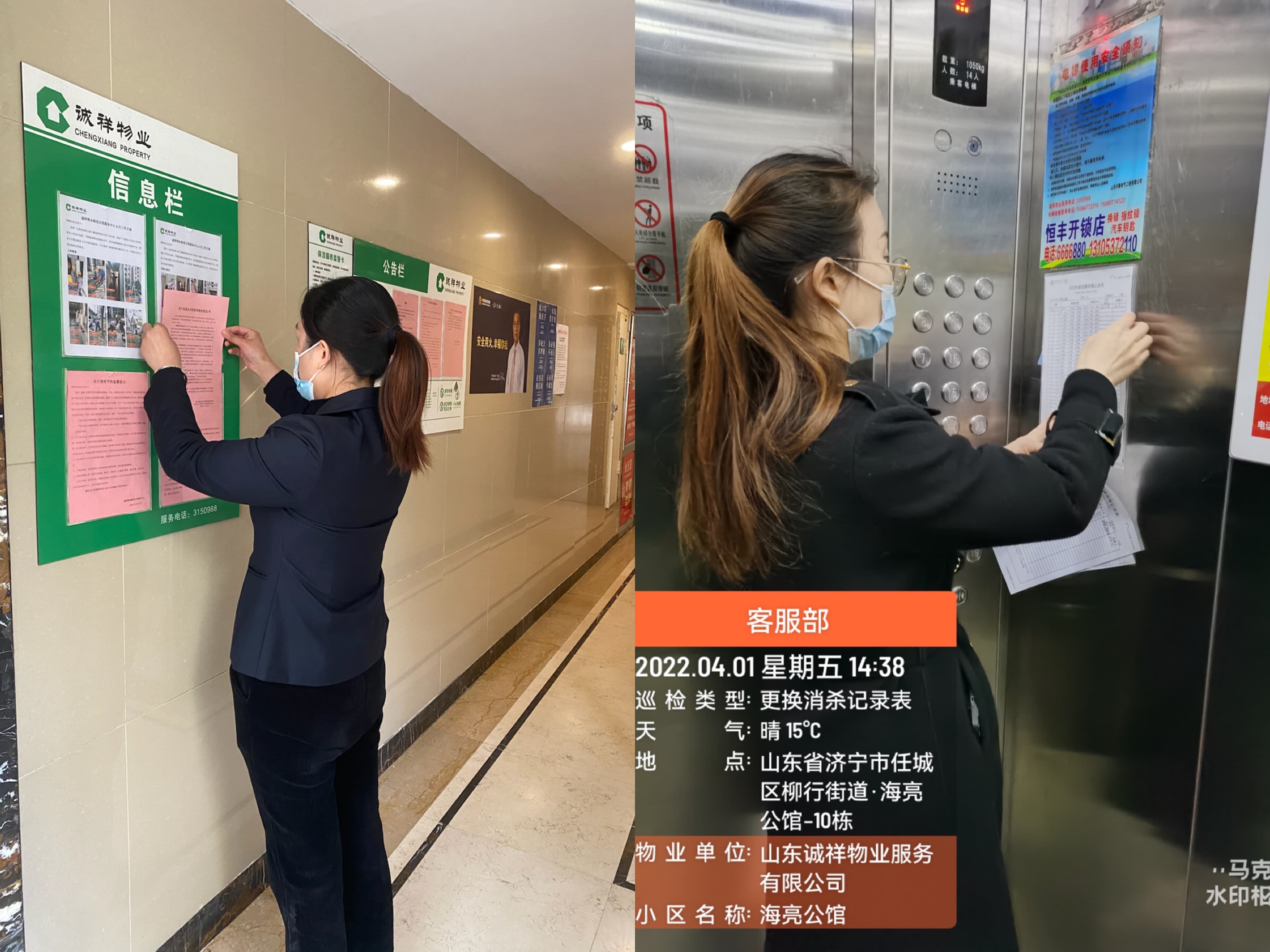 诚祥物业各项目每天定时对单元出入口、主干道、楼道步梯、电梯轿厢、垃圾桶四周等公共区域及配套公共设施展开全覆盖式消杀工作,并对门把手、电梯按钮等业主高频交叉接触部位进行消毒擦拭。确保每个环节严谨认真,守好每一道防线,为业主提供安心、安全的居住环境。