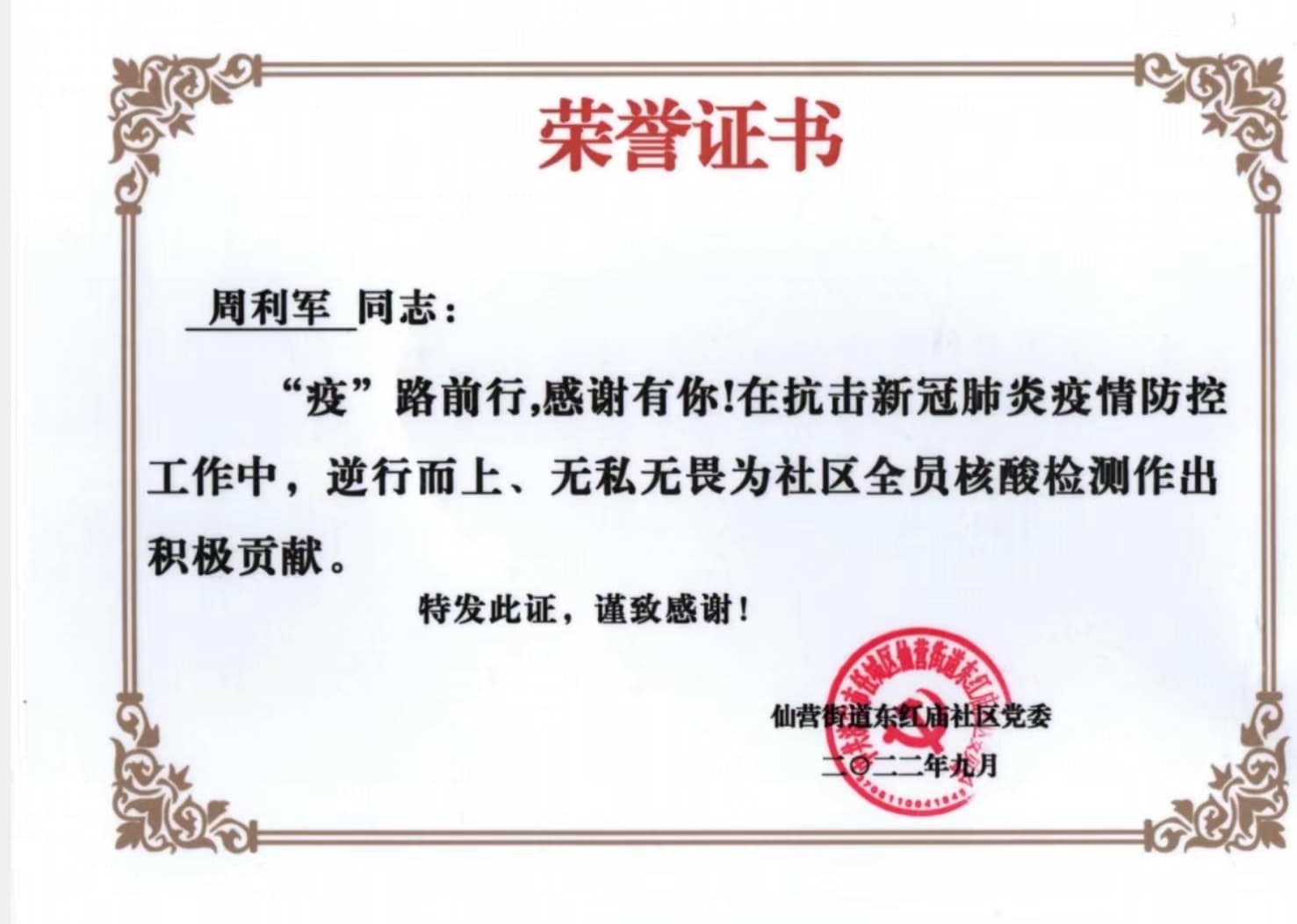 嘉禾苑项目员工周利军被仙营街道东红庙社区党委颁发“疫情防控”荣誉证书
