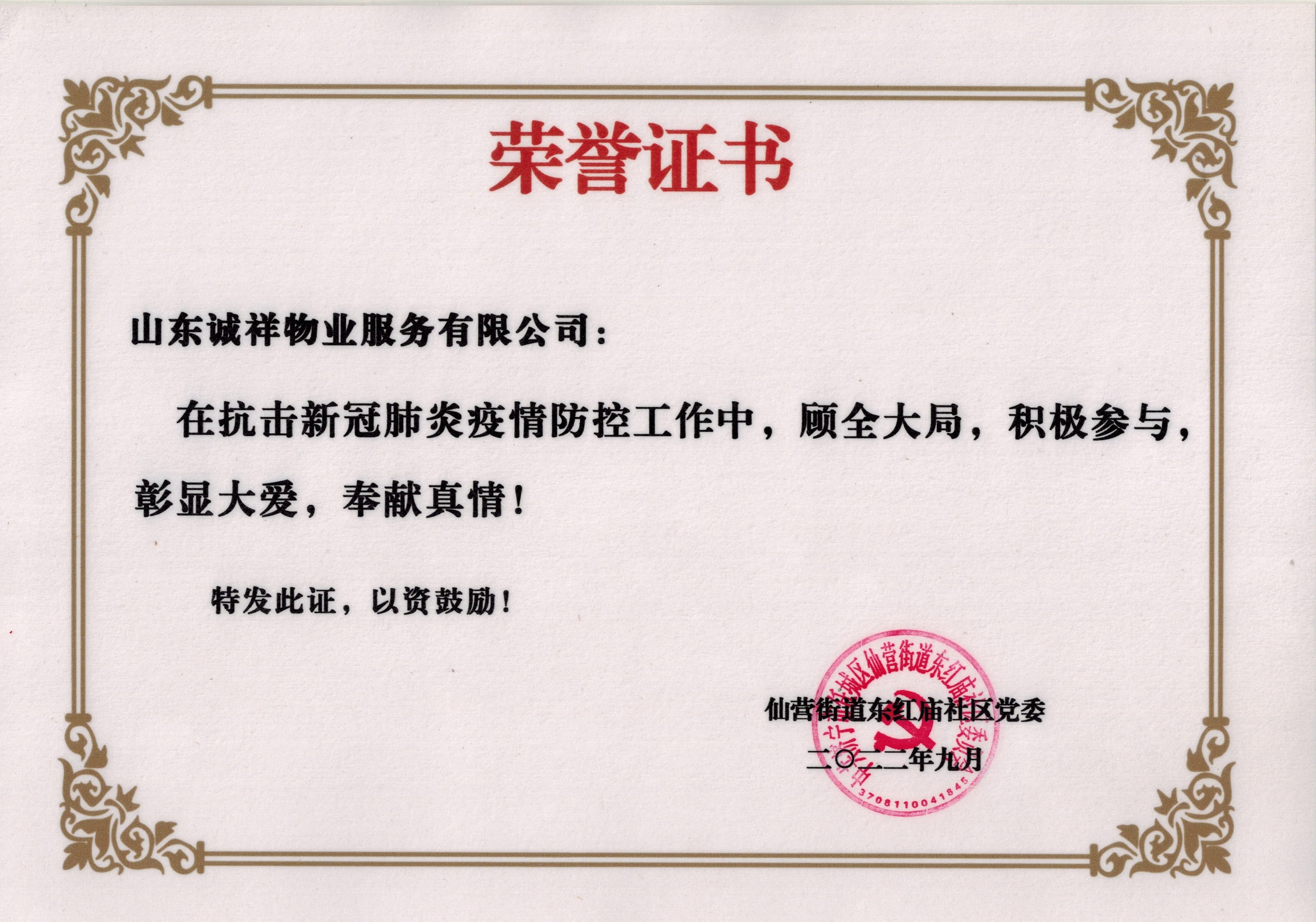 自疫情发生以来,诚祥物业全体员工临危不惧、迎难而上,舍小家为大家,一致获得业主们的高度赞扬,他们用实际行动赢得了社会和业主们的尊重与肯定。同时,诚祥物业及员工也荣获了街道社区授予的“疫情防控工作”荣誉证书,这既是地方政府单位对诚祥物业人抗击疫情工作的充分肯定,也是对诚祥物业广大员工的鞭策鼓励。