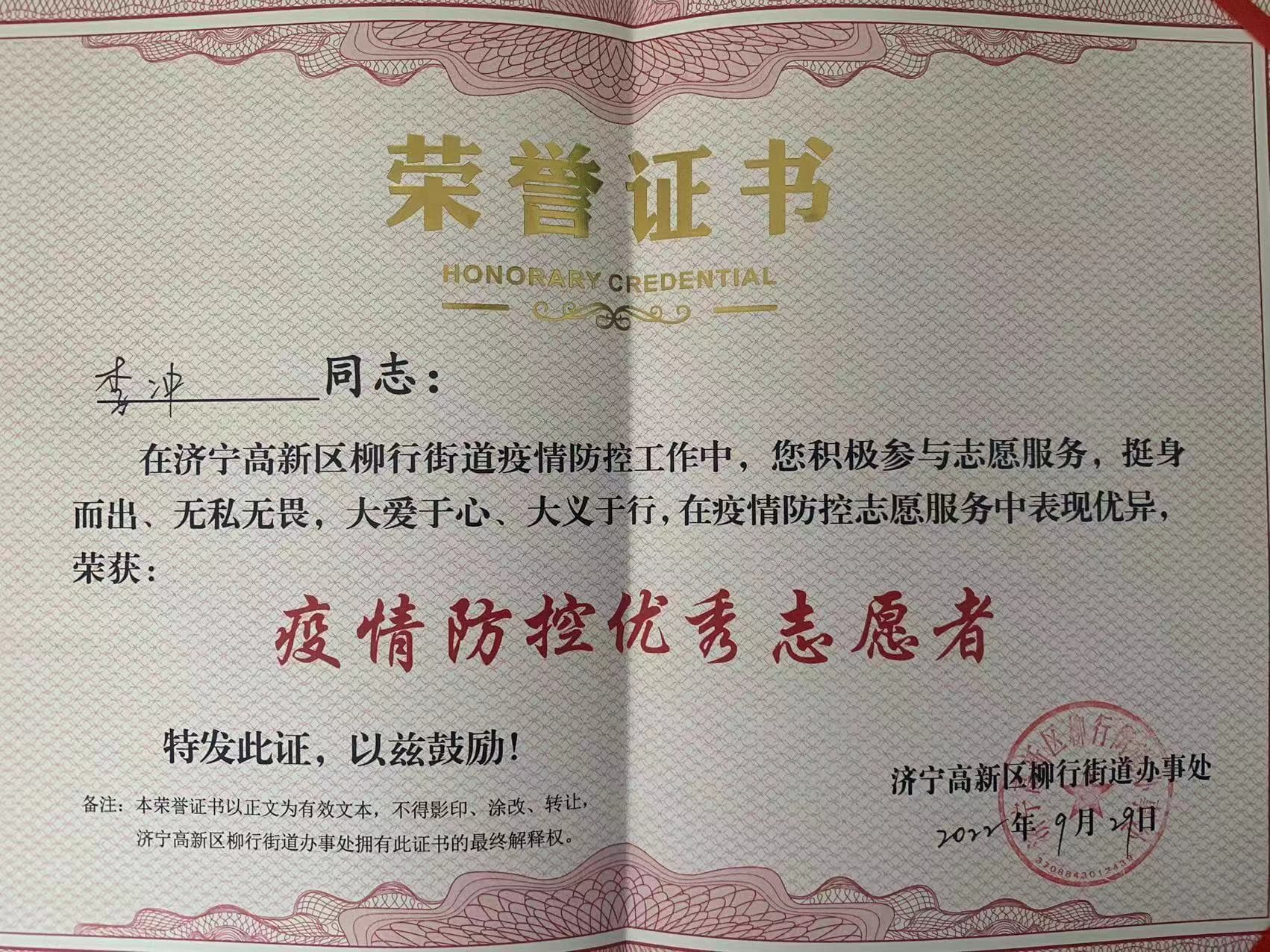 海亮公馆项目经理李冲被柳行街道评为“疫情防控优秀志愿者”荣誉称号