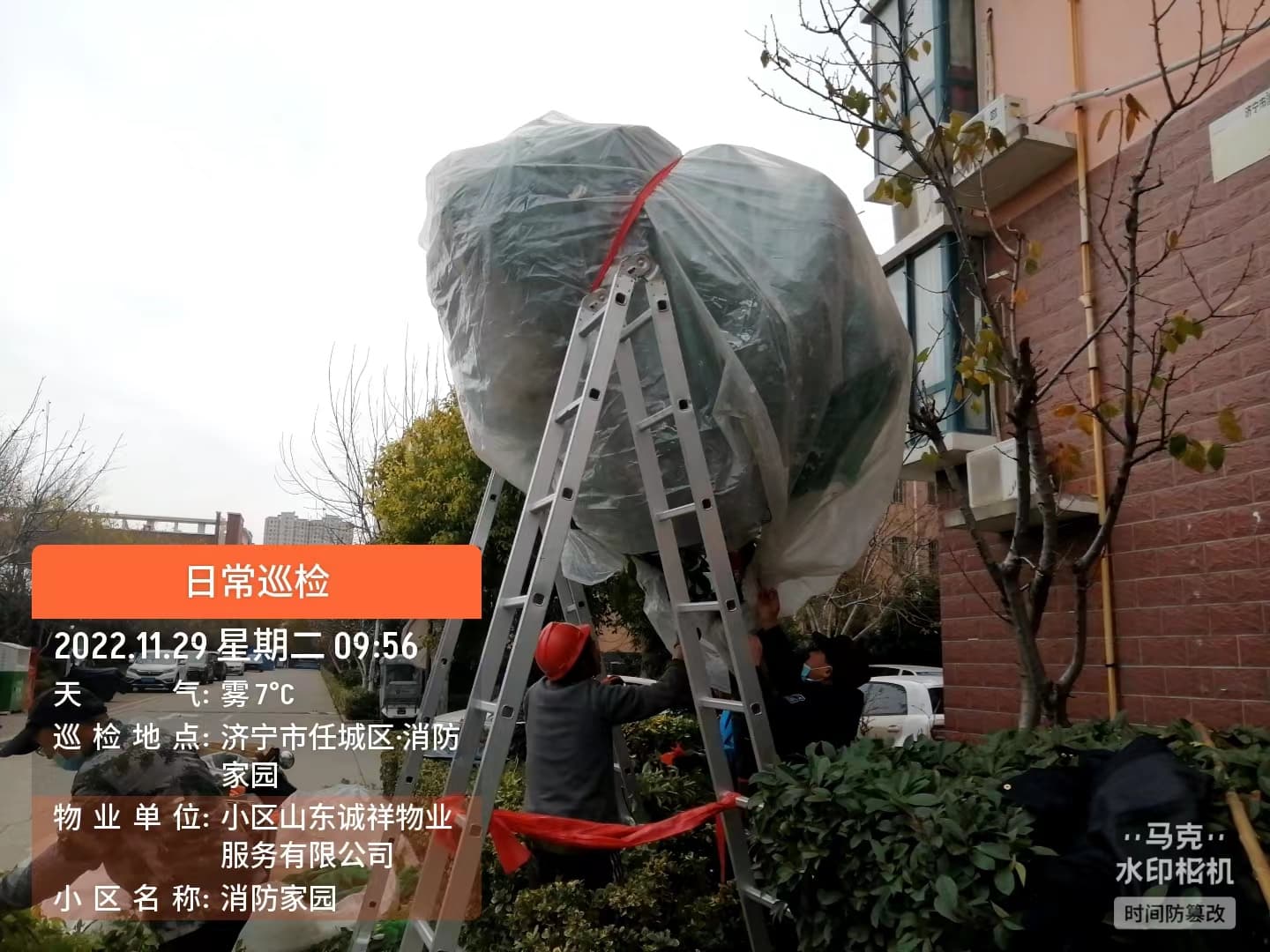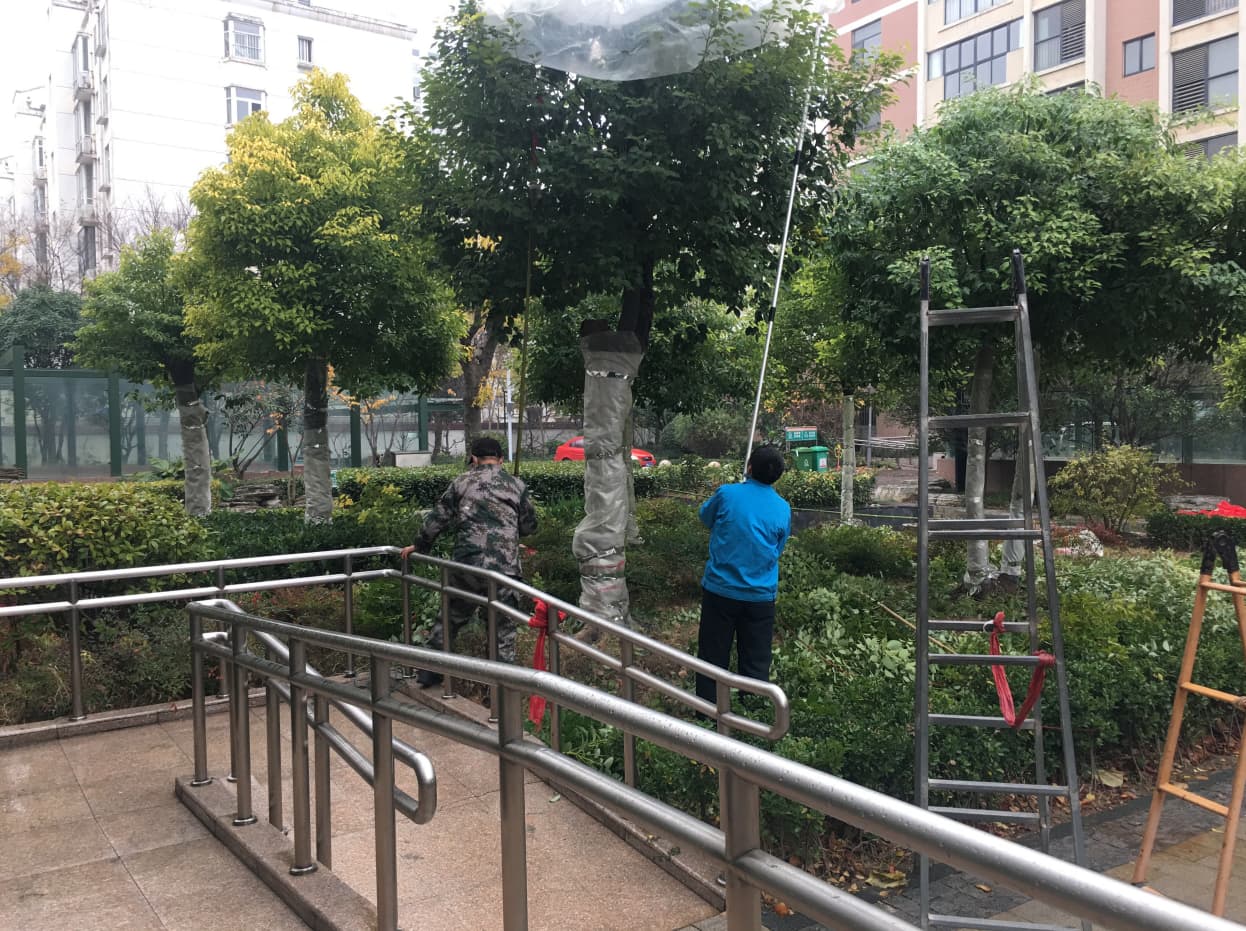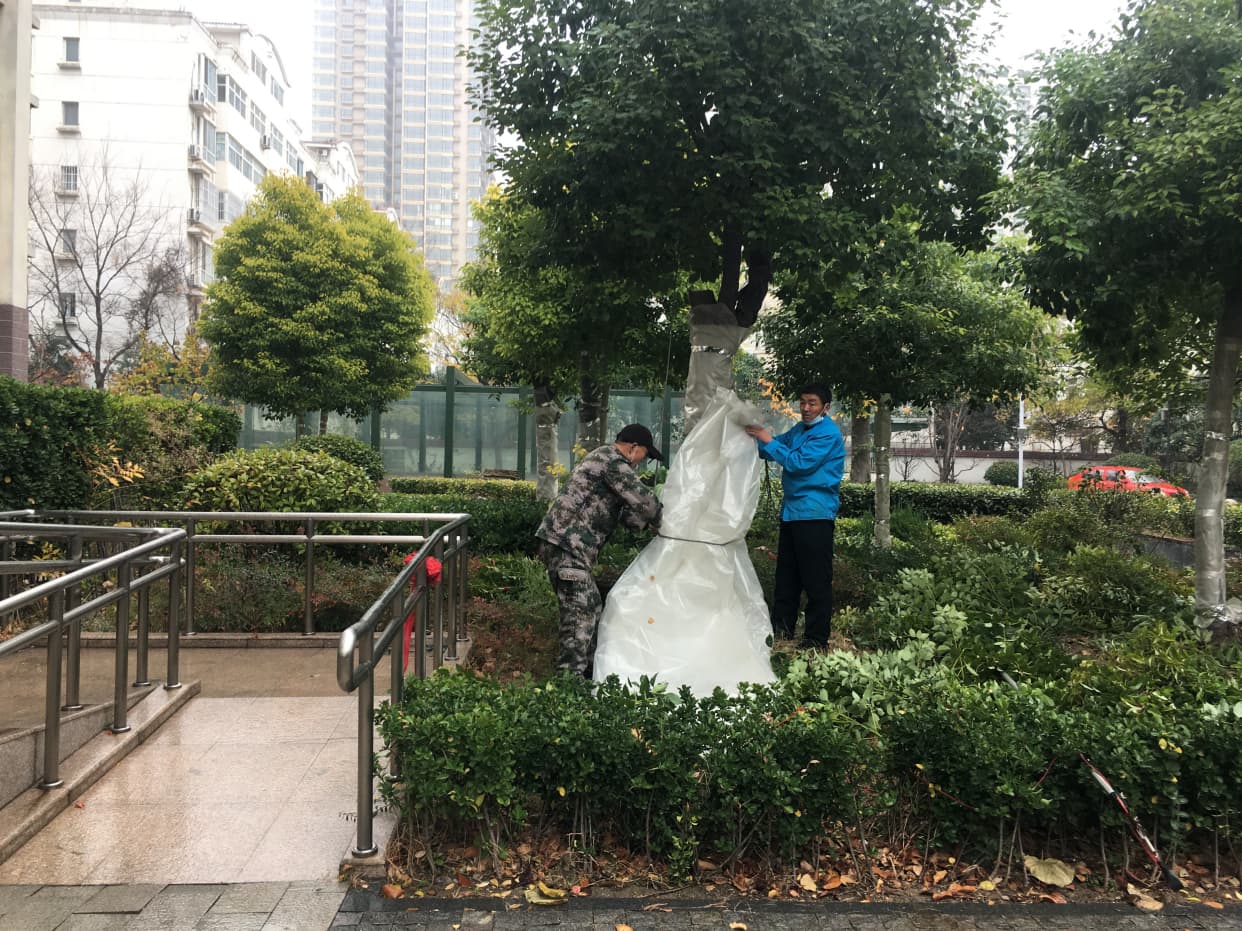 为保护树木安全过冬,为开春生长储存能量,各项目工作人员针对不同树木的特性,开展树木涂白、包裹等保暖工作,保证树木顺利过冬。同时,对部分树木枝干进行修剪,避免雨雪天气树枝断折为业主通行带来安全隐患。