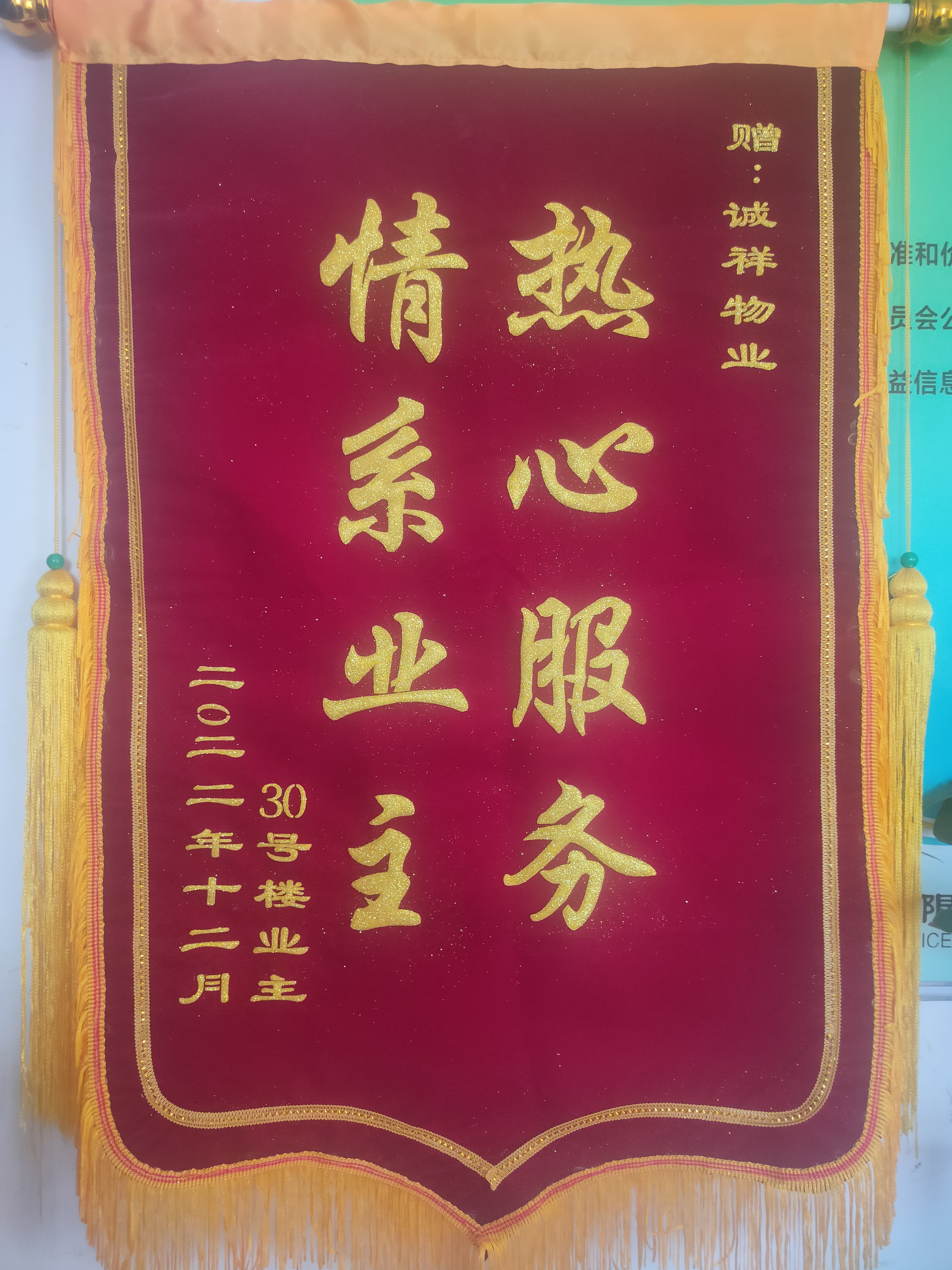 一事一物皆品质,一言一行皆服务,锦旗虽小,意义重大。既是对诚祥物业的认可也是鞭策。业主的满意只是服务的起点,今后,诚祥物业全体员工将带着这份沉甸甸的心意,不负业主信任,继续保持良好的工作态度,用心服务业主,用细节和品质打动业主,让广大业主真切感受到来自诚祥物业的每一份问候和关怀,以高品质的服务,为业主创造干净、和谐、幸福的生活环境!