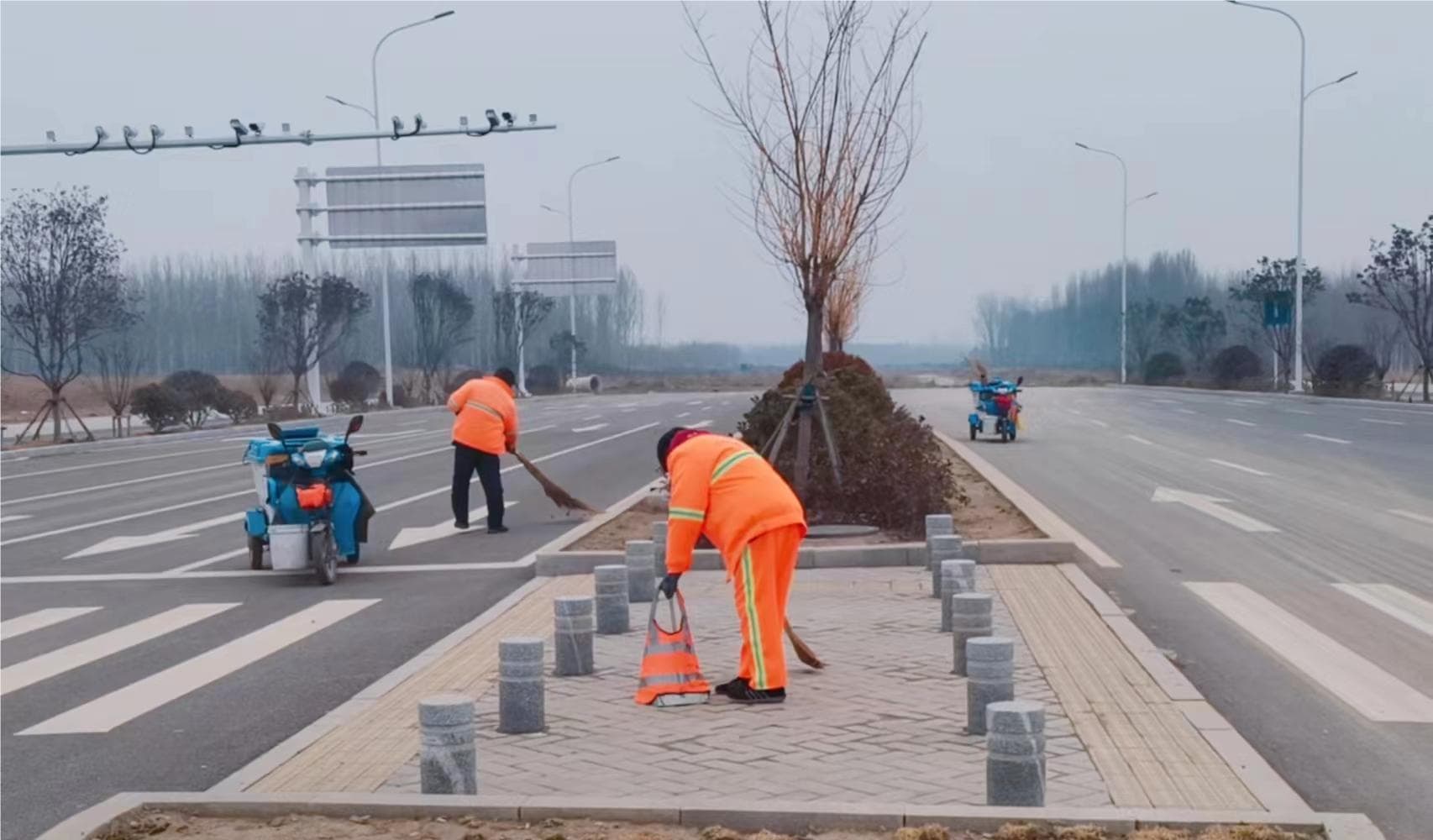 从路面、树穴,再到绿化带、边沟,捡拾果皮纸屑、烟头、塑料瓶等废弃物,所到之处,垃圾无所遁形。环卫工人不惧冬天寒冷,不遗余力,一步步挪移,一次次弯腰,认真清理垃圾,保障了城市的干净、美丽。