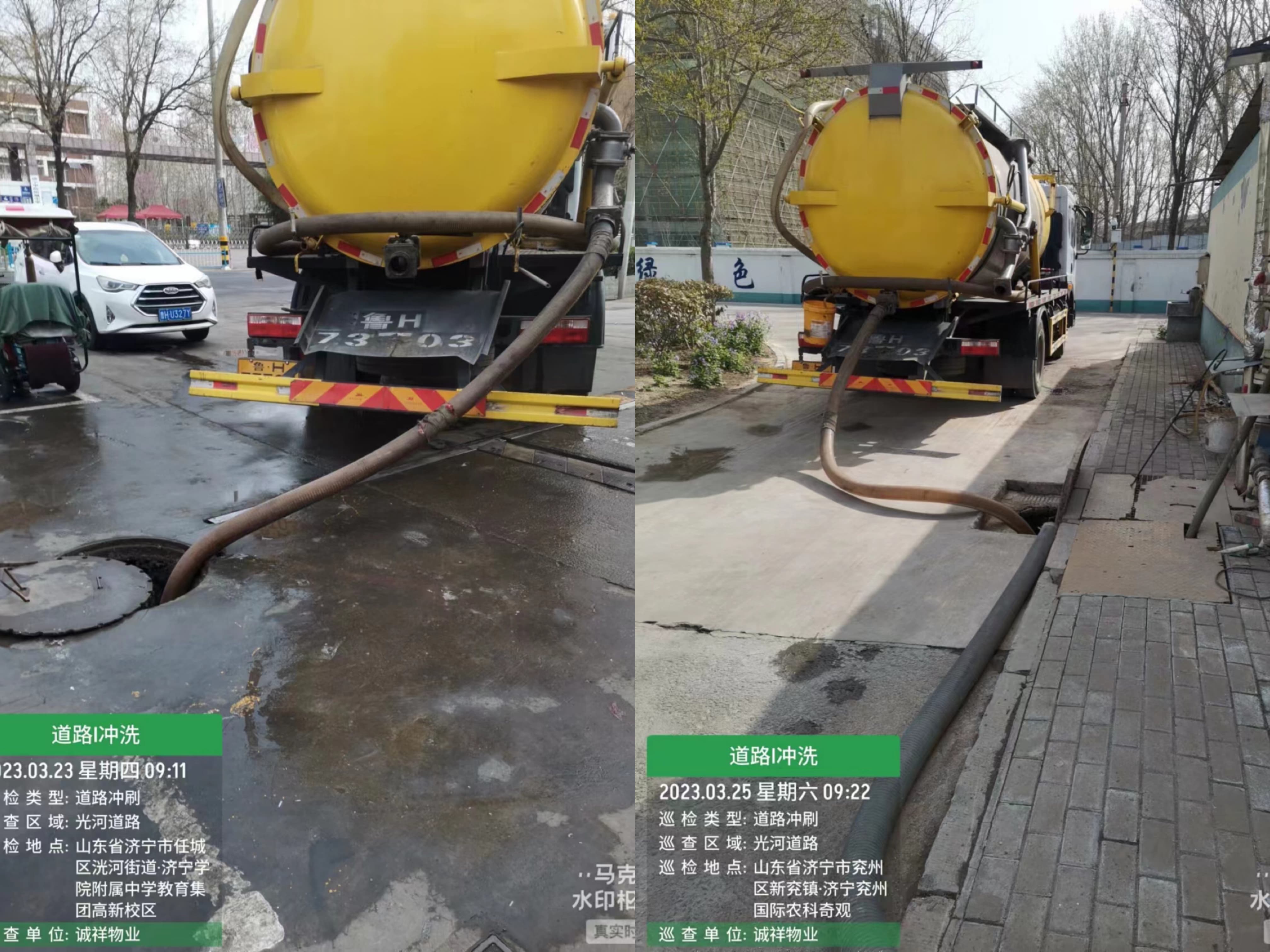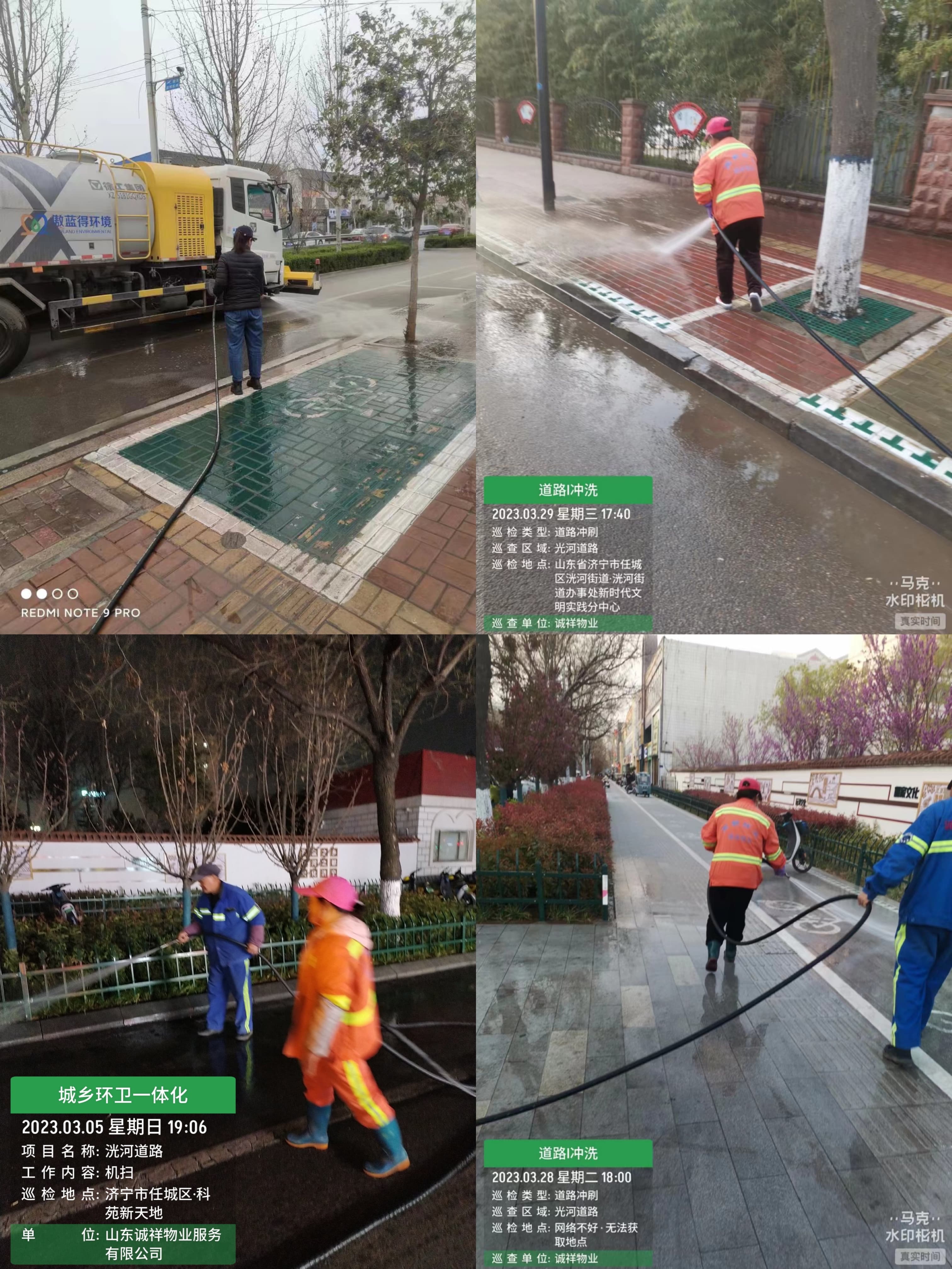 环卫工人通过对辖区道路,利用高压水枪冲刷地面的方式,清理灰尘,效果显著。增加城市道路湿化作业,对重点地区、城市道路、居住小区等区域开展全覆盖湿化。