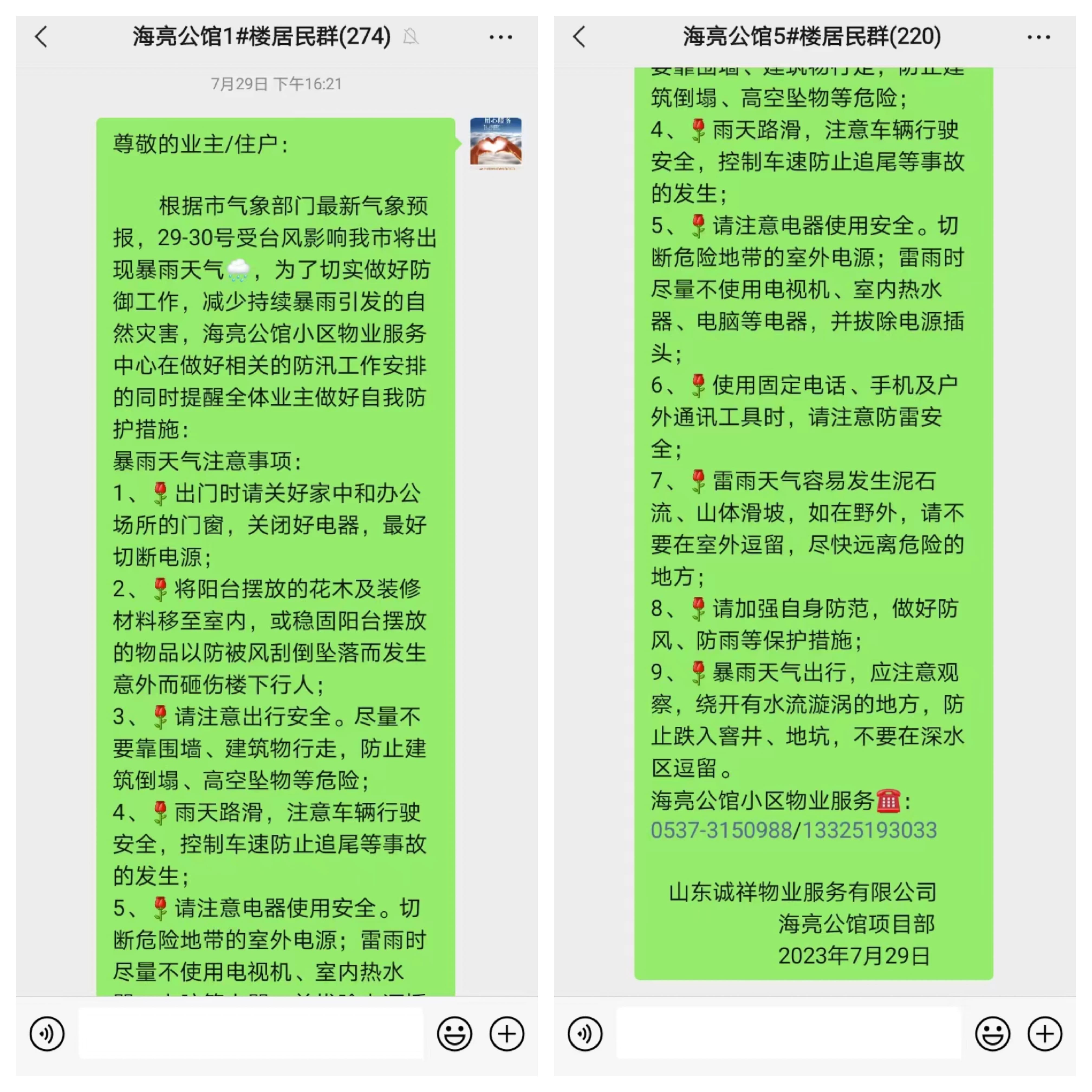 夏季是台风和暴雨频发的季节,诚祥物业各项目接到防御第5号台风“杜苏芮”防汛通知后,立即动员物业工作人员做好防台、防汛相关的部署准备工作,同时客服管家在业主群、公告栏发布台风暴雨来袭的温馨提示,全力保障业主安全。
