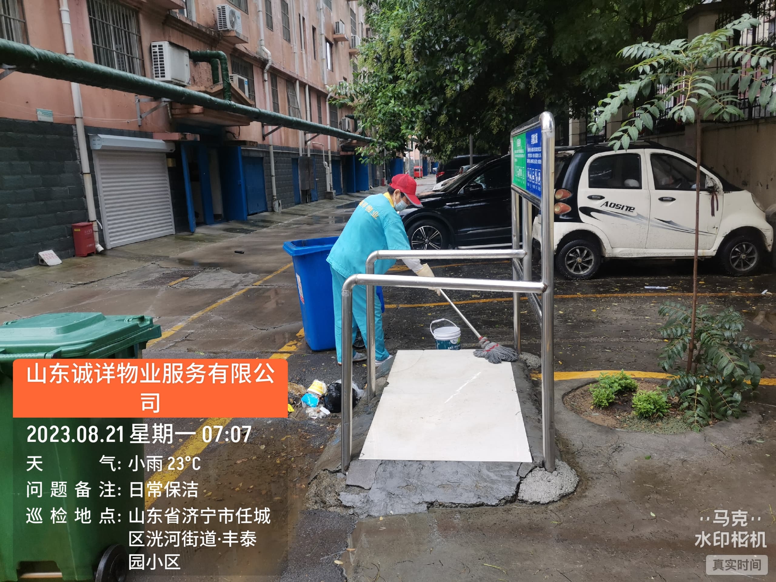 保洁人员日复一日的对园区内路面冲洗清扫,并深入各楼栋对单元门擦洗干净、楼道楼梯清扫,保证住户周边环境干净、整洁。