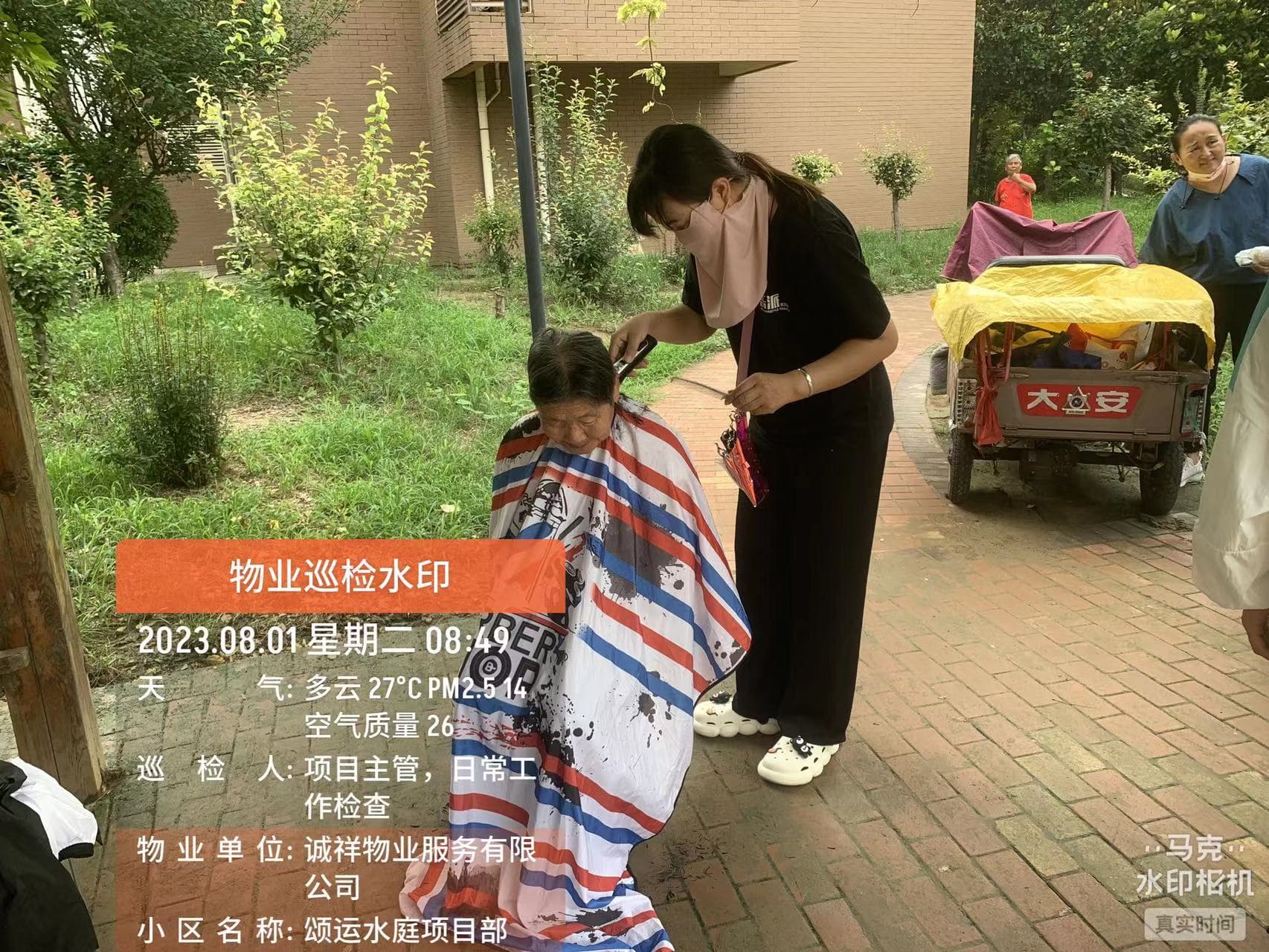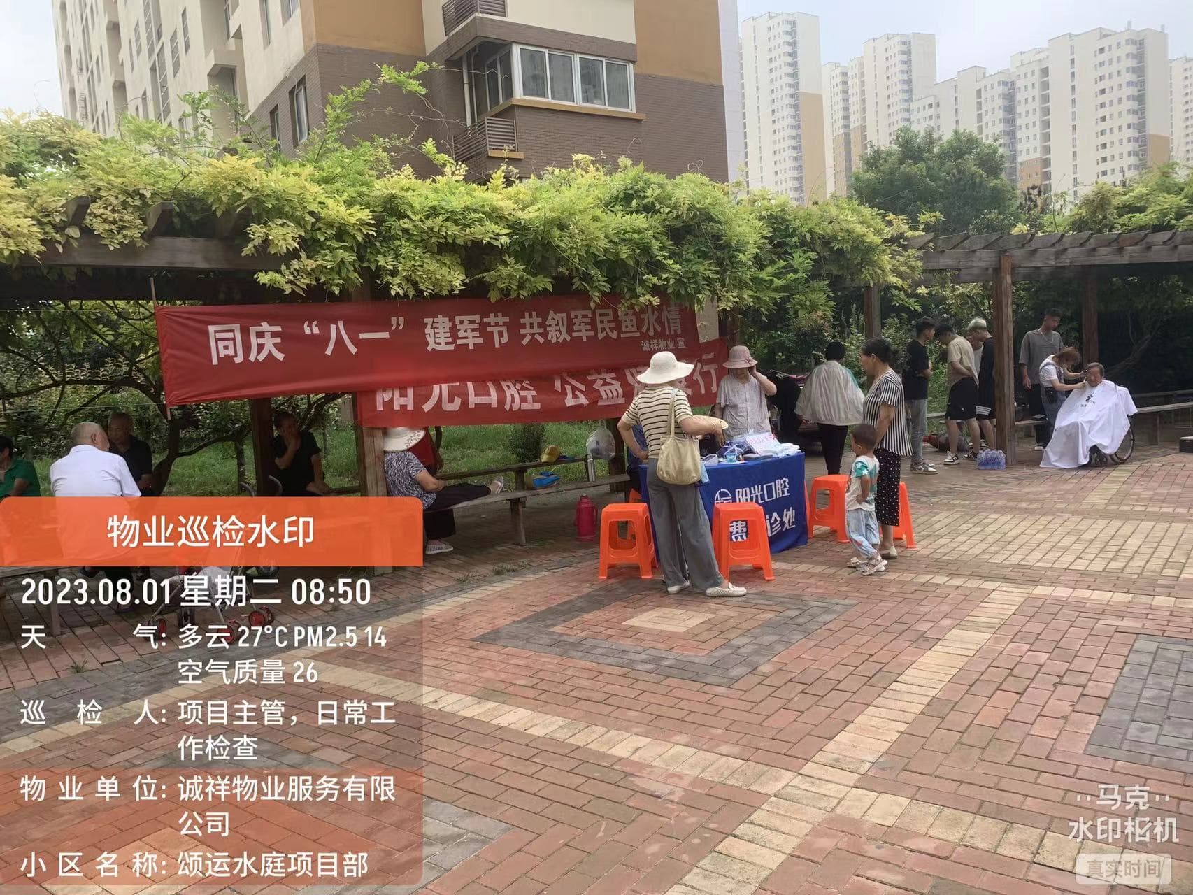 为庆祝“八一”建军节,进一步弘扬爱国拥军的光荣传统,营造尊崇军人的良好社会风尚,诚祥物业颂运水庭B区联合阳光口腔医院、乐派美发开展“同庆八一建军节,共叙军民鱼水情”便民服务活动。
