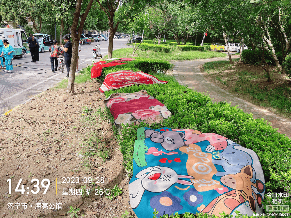 业主家人们陆陆续续带着各式各样的地垫来到清洗现场。物业工作人员便开始了忙中有序的清洗工作,将地垫铺开,刷子、清洁剂、高压水枪配套齐全。上下左右来回洗、冲刷,每一个边边角角都不放过。